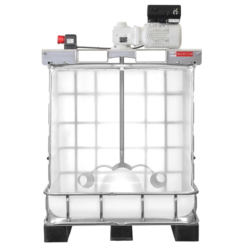 L’agitateur VJ350 de VISCO JET est le complément idéal pour les IBC d’une capacité de 600 ou 1000 litres. La personnalisation pour d’autres conceptions IBC est également possible sur demande.