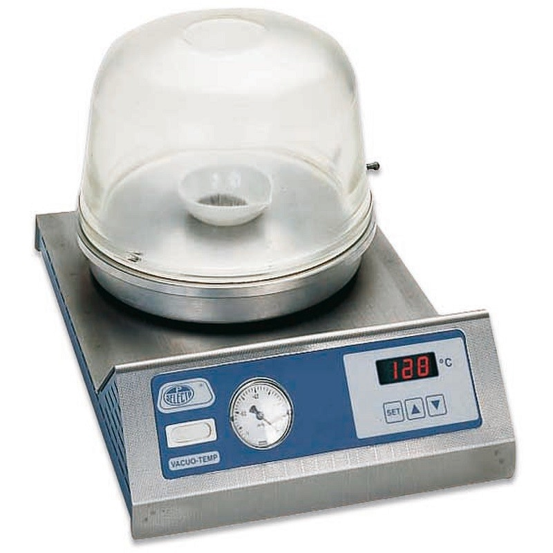 Dessiccateur thermostatique sous-vide Vacuo-Temp Selecta. Le dessiccateur thermostatique sous vide VACUO TEMP est conçu pour permettre la dessiccation à des températures réglables depuis la température de ambiance + 5°C jusqu'à 170°C avec une stabilité de +/-2%. La régulation de la température est électronique avec lecture (3 digits) à résolution de 1 digit. Le Dessiccateur Vacuo-Temp comprend une sonde de température Pt100, un élément chauffant blindé, une connexion extérieure vers une pompe à vide, une vanne pour prise de vide, une cloche en verre trempé, un joint de silicone et un thermostat de sécurité. La plaque supérieure est réalisée en alliage spécial d'aluminium avec une surface rectifiée et rigole pour joint d'étanchéité. Le corps extérieur réalisé en acier inox AISI 304